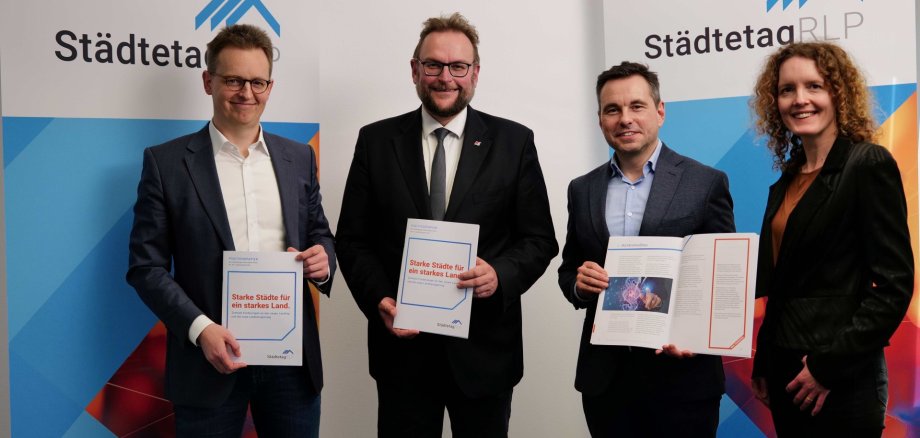 Michael Mätzig (STT), Markus Zwick (Vorsitzender des Städtetags und Oberbürgermeister von Pirmasens), David Langner (stellvertretender Vorsitzender und Oberbürgermeister von Koblenz), Lisa Diener (STT)